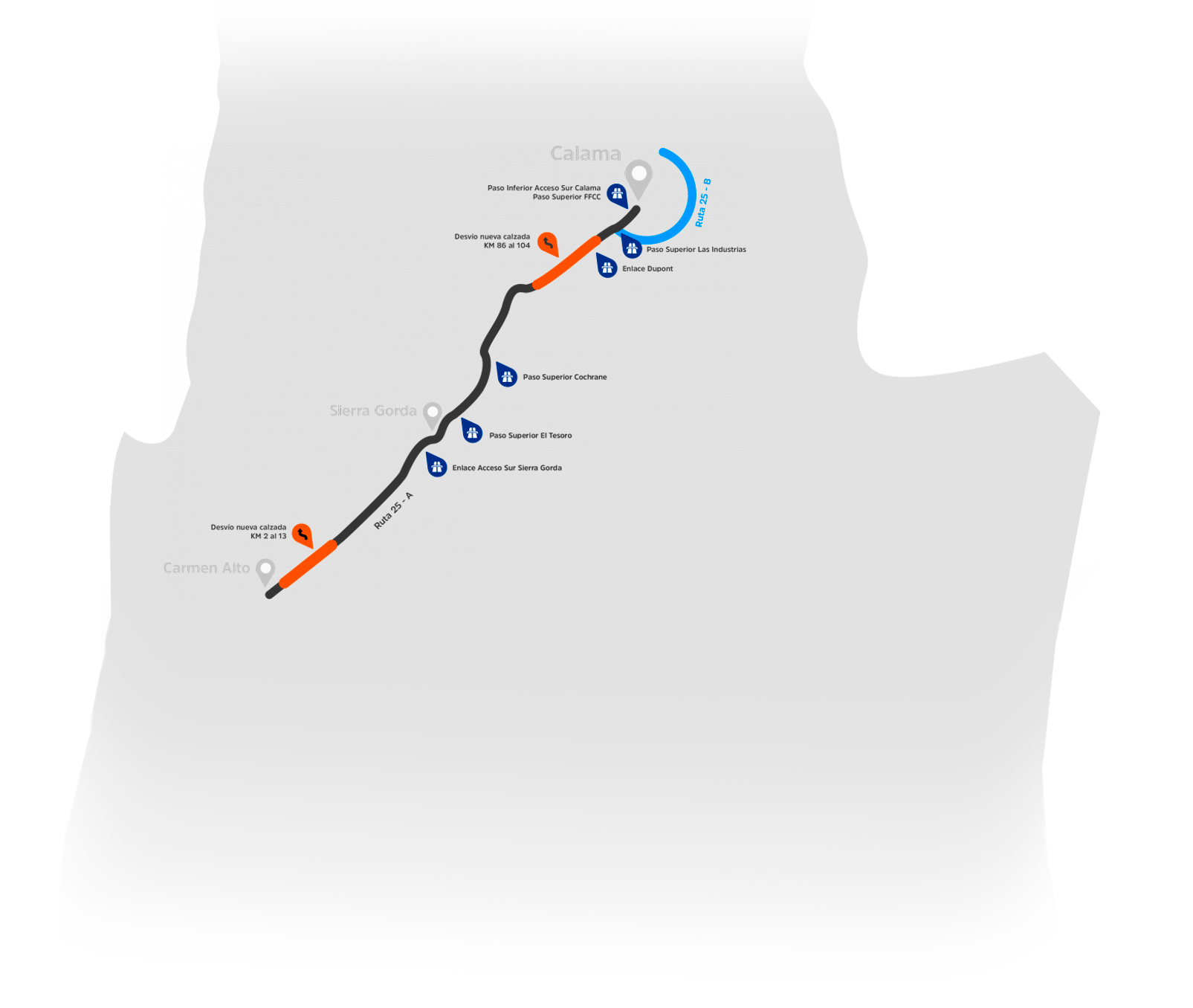 Contempla el mejoramiento y la ampliación a doble calzada de la actual Ruta 25, en el tramo comprendido entre Carmen Alto (cruce con la Ruta 5) y el empalme con Av. Balmaceda, en el sector donde actualmente se encuentra la rotonda del acceso sur a la ciudad de Calama.