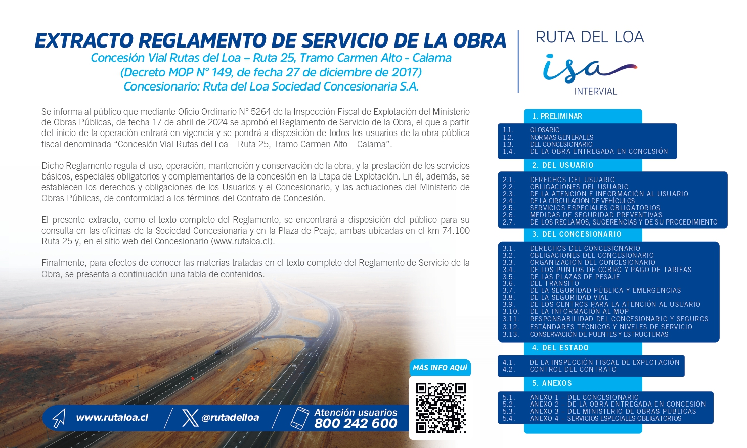 El Usuario tiene derecho a recibir información general sobre los servicios que el Concesionario otorga conforme al Contrato de Concesión, de manera de utilizarlos integralmente. Dicha información incluye tanto la contenida en el presente Reglamento como otra accesible vía internet en el sitio web del Concesionario (www.rutaloa.cl) u otros medios de que disponga éste.